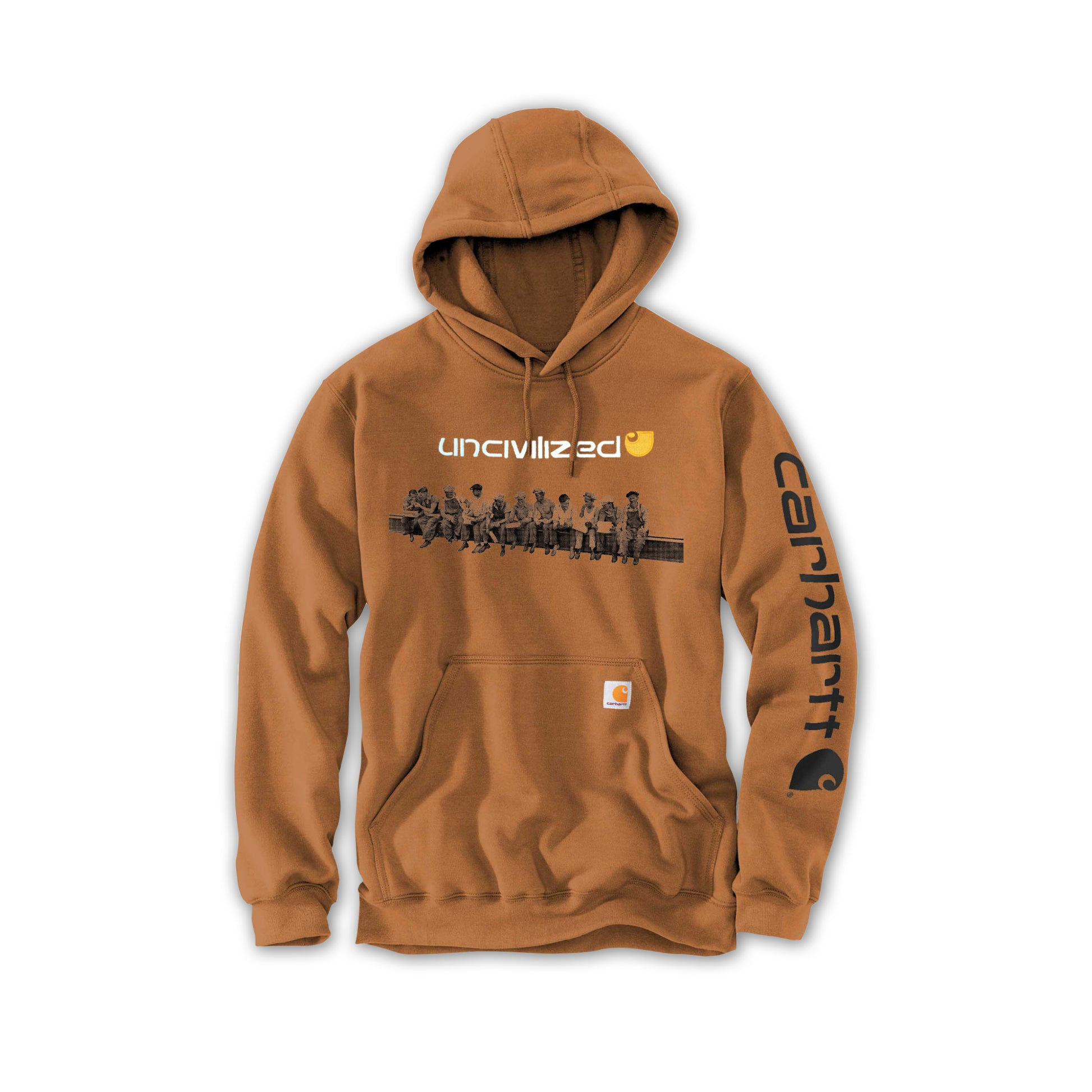 Never before released. Carhartt mid-weight loose fit hoodie. Embroidered logo with hand printed Lunch Atop graphic underneath.