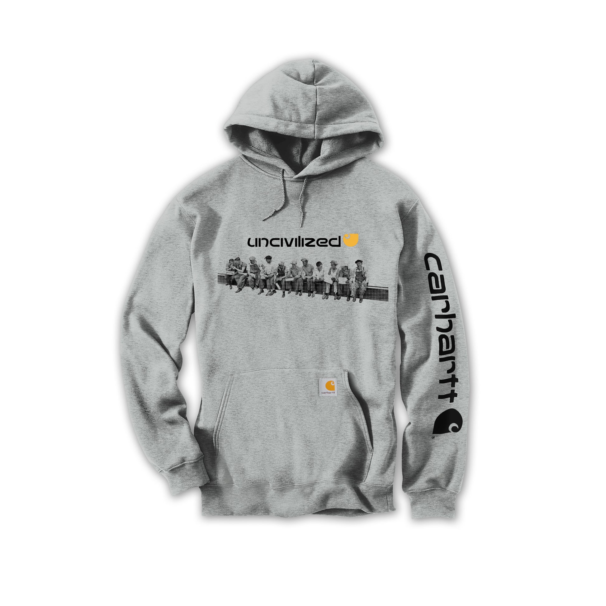 Never before released. Carhartt mid-weight loose fit hoodie. Embroidered logo with hand printed Lunch Atop graphic underneath.