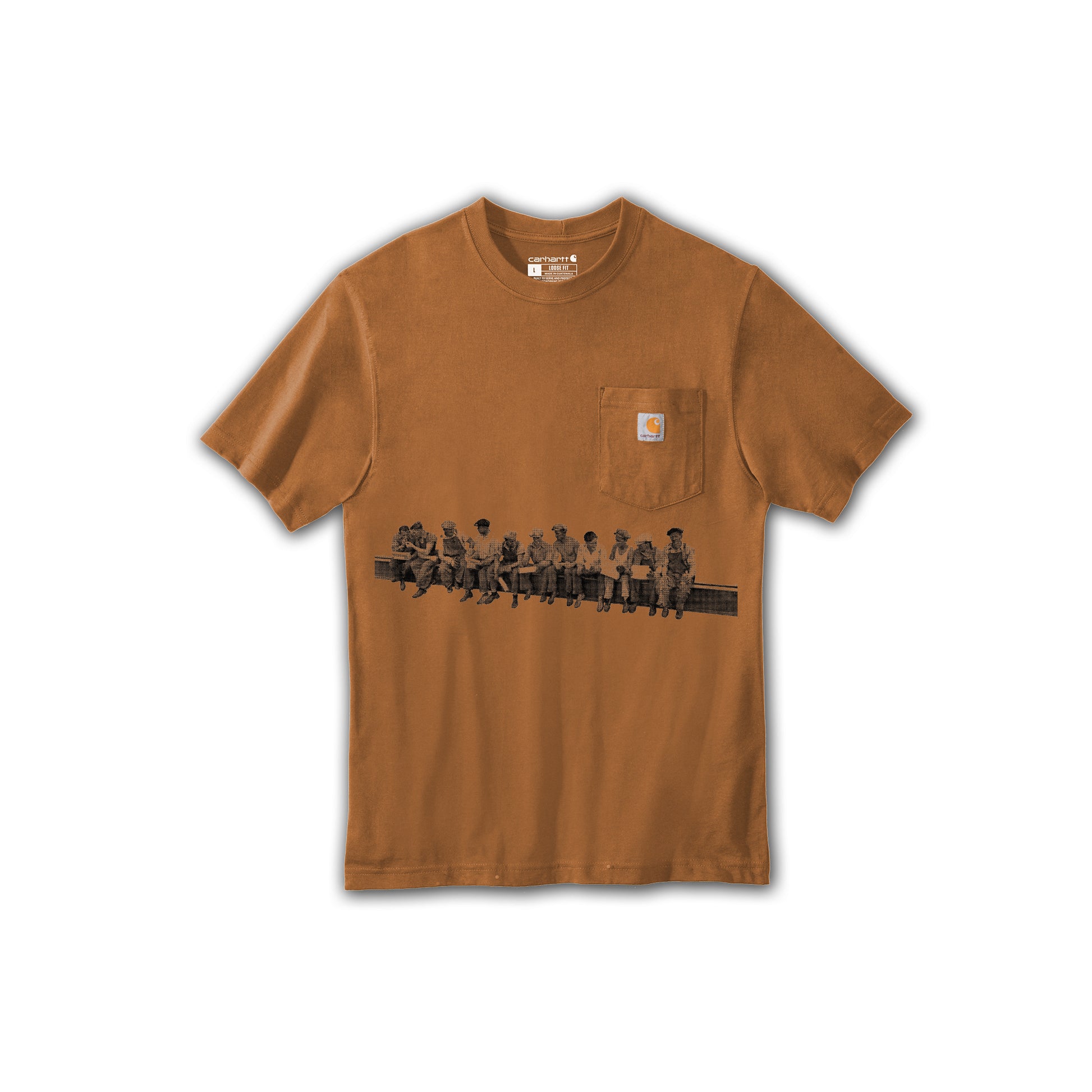 Carhartt brown. Pocket. Durable 6.75-ounce, 100% cotton. Loose fit. Hand printed graphic.